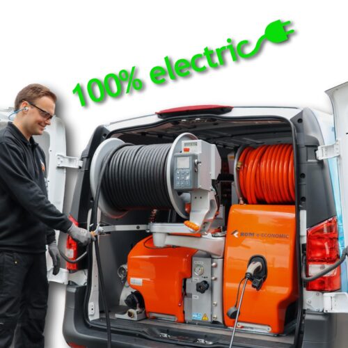 ROM E-Economic är ett 100 % batteridrivet spolaggregat byggt för professionell användning. Den installeras i skåpbilar och levererar högre kapacitet än Cube, vilket gör den idealisk för företag som behöver arbeta längre mellan påfyllningarna och ta sig an tuffare stopp.